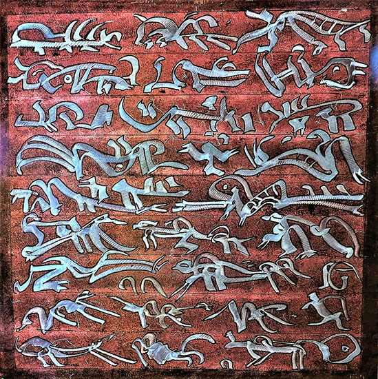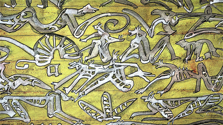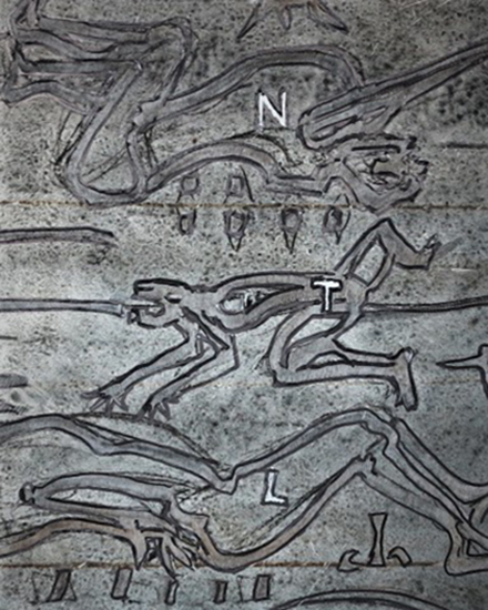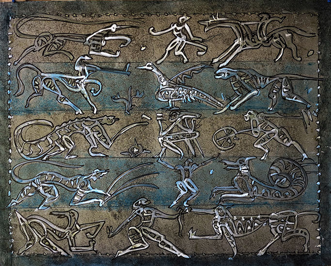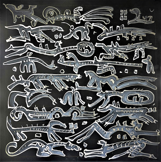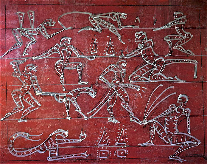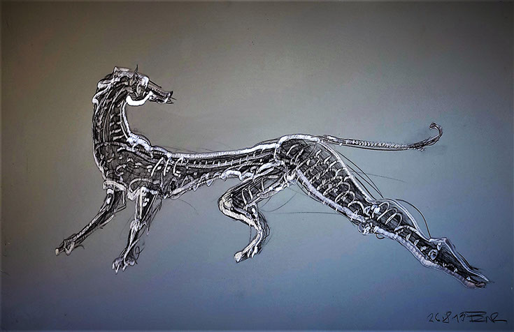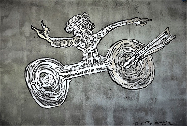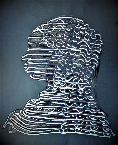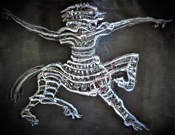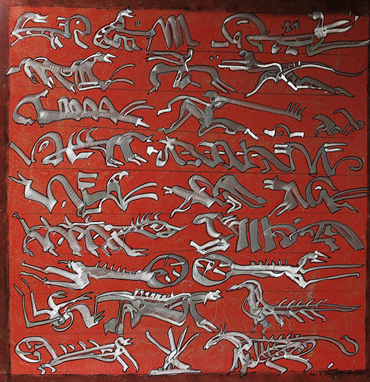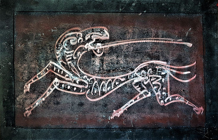Auf beschichtete und lasierte Aluminiumplatten werden Motive gezeichnet, die mit einem Winkelschleifer ausgeführt werden, sodass die Linien als blankes Metall zutage treten. Durch Lichteinstrahlung entstehen verschieden starke Reflexe, welche die Zeichnungen je nach Blickwinkel kinetisch beleben.