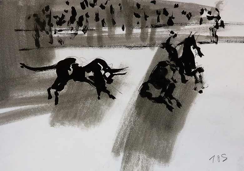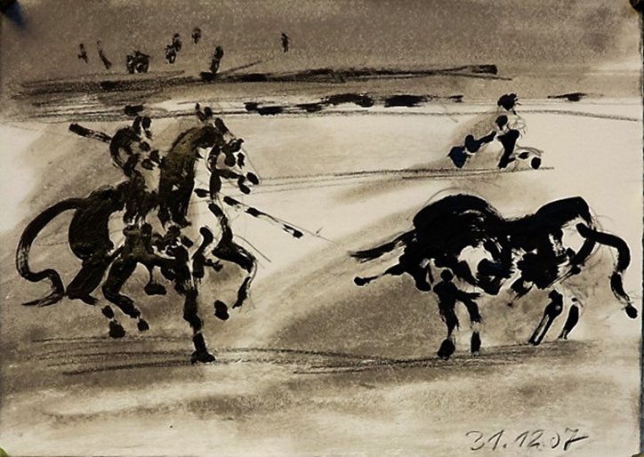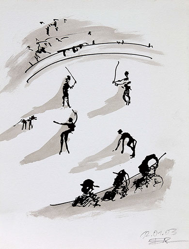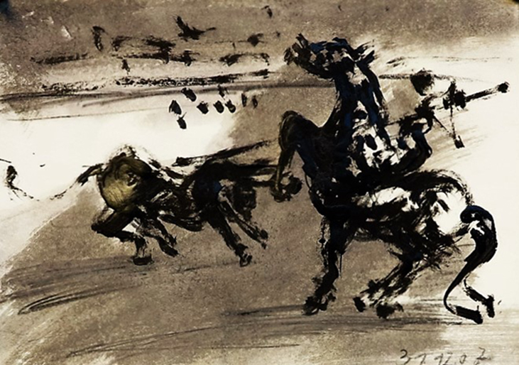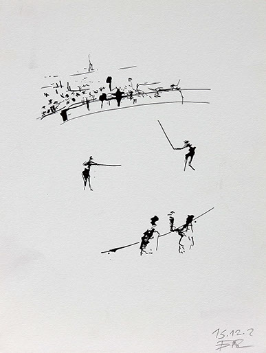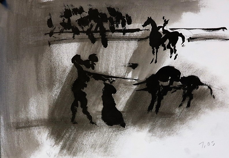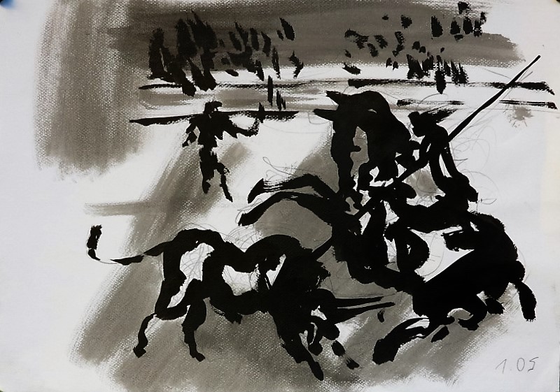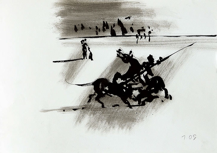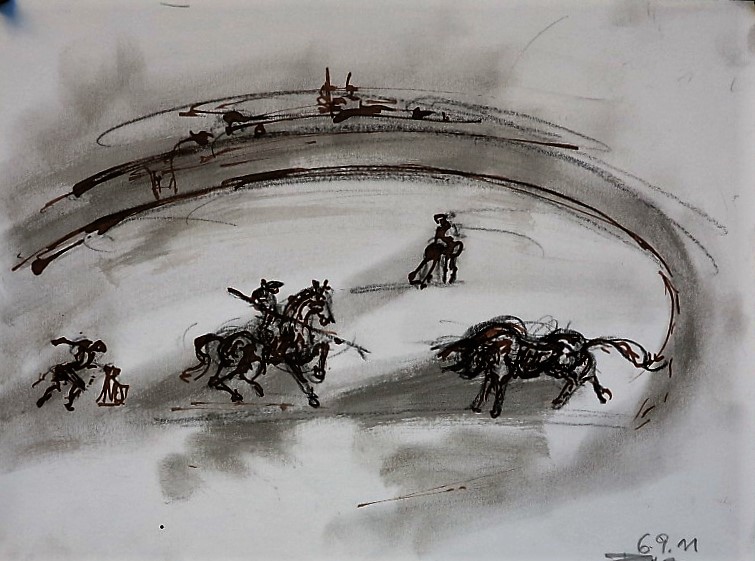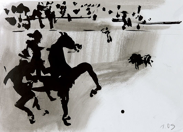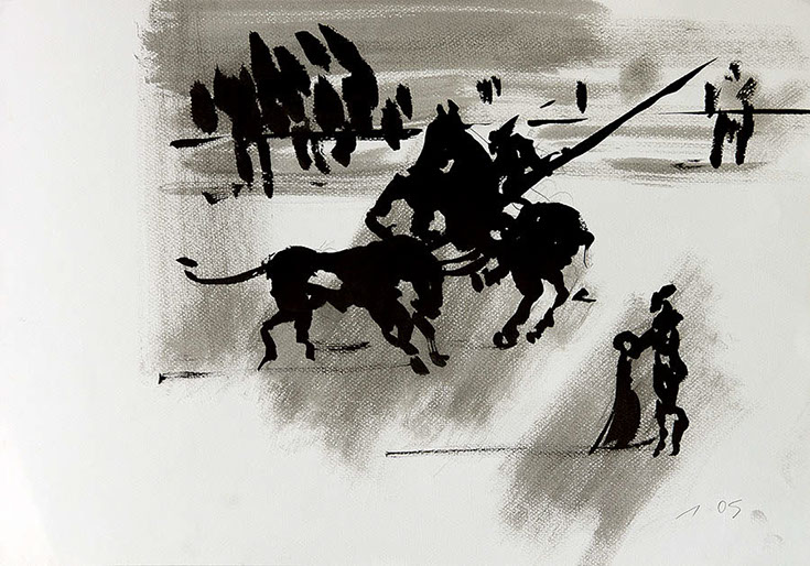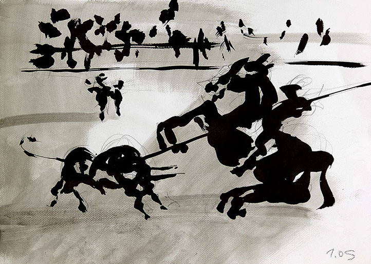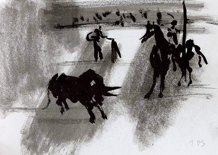 Der Stierkampf ist ein archaisch-ritueller Kampf von starker Symbolik. Feierliche, hieratische Bewegungslosigkeit steht der wilden Bewegung des angreifenden Tieres gegenüber. Es ist keine existentielle, aber eine künstlerische Herausforderung, mit Pinsel und Tusche die Angst und die Wut, die beherrschte Ruhe und den Ansturm in das Bild zu ziehen.