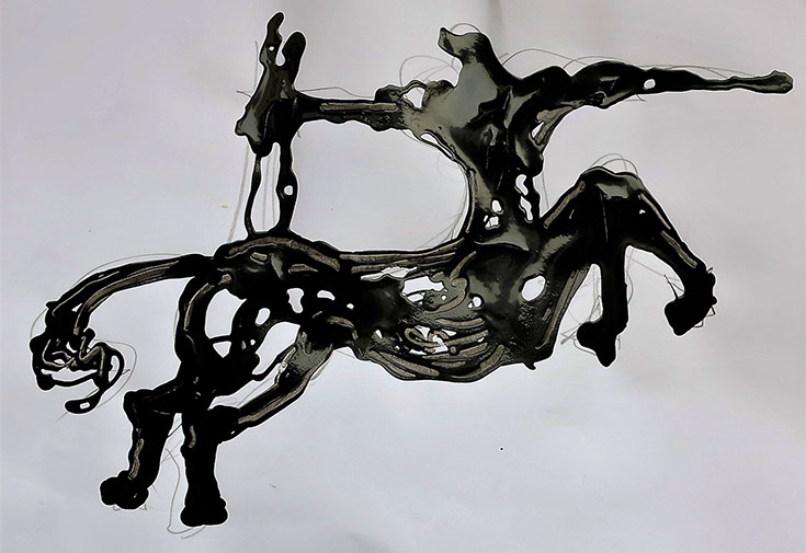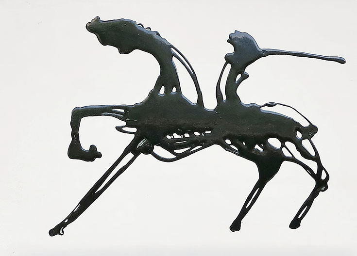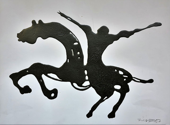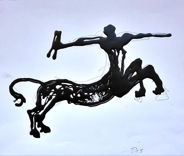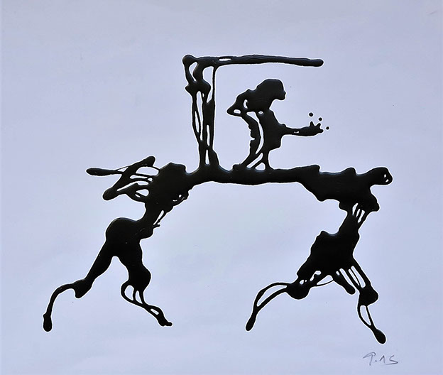 Flüssige schwarze Acrylfarbe, in dünnem Strahl auf den Bildträger gezeichnet. – besser gesagt geschrieben: es ist ein kalligraphischer Zugang. - Dynamische Konzentration auf dem Weg zur Hieroglyphe.